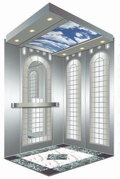 轿顶:中部是影像拱顶,两侧为不锈钢底板上辅以筒灯的柔光照明设计。