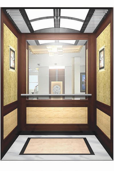 轿顶:镜面不锈钢框架配中空灯柱,中间部分是亚克力拱形。