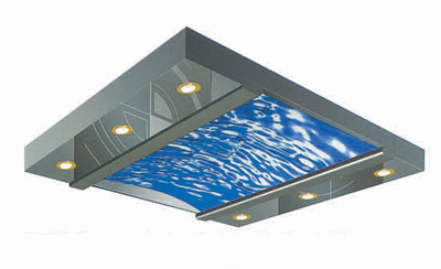中部是影像拱顶,两侧为不锈钢底板上辅以简灯的柔光照明设计。